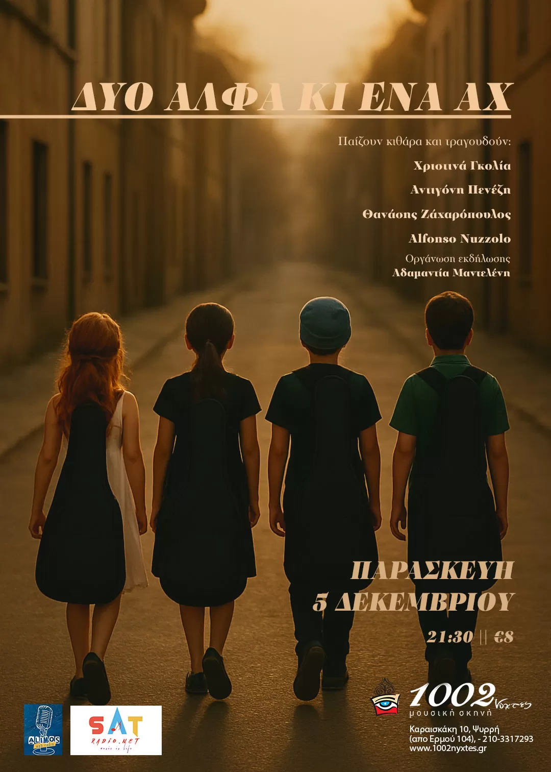 Θα ακουστούν τραγούδια από την Ελληνική και Βαλκάνια παράδοση μέχρι τον Μισσσισιπή και από την θερμή Κάτω Ιταλία ως τη βροχερή Αγγλία. Με αφορμή τα πρώτα τους μουσικά βήματα και με προορισμό το σήμερα, δημιουργούν την παράσταση «Δύο Άλφα κι ένα Αχ».