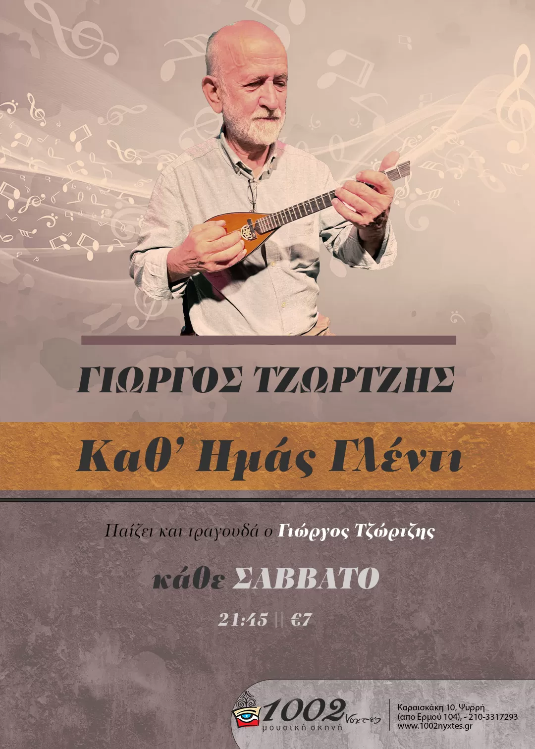 Στον καλαίσθητο και ατμοσφαιρικό χώρο της μουσικής σκηνής «1002 Νύχτες», το μυσταγωγικό ύφος του Γιώργου Τζώρτζη, ενός καλλιτέχνη με μακρά πορεία στο ελληνικό τραγούδι συναντά την ανερχόμενη λαϊκή ερμηνεύτρια Μαρία Πλυτά σε εορταστικό πρόγραμμα γεμάτο κέφι και επιλεγμένες μουσικές. Το ταμπεραμέντο των δύο ερμηνευτών, πλαισιωμένο από δύο αξιόλογους μουσικούς στο μπουζούκι και την κιθάρα, το πλούσιο και ποιοτικό γιορτινό μενού, με εδέσματα και ποτά ιδιαιτέρως επιμελημένα για την γιορτινή περίσταση αλλά και το ζεστό, φιλικό περιβάλλον του χώρου, δημιουργούν τις προυποθέσεις για μια αξέχαστη βραδιά.