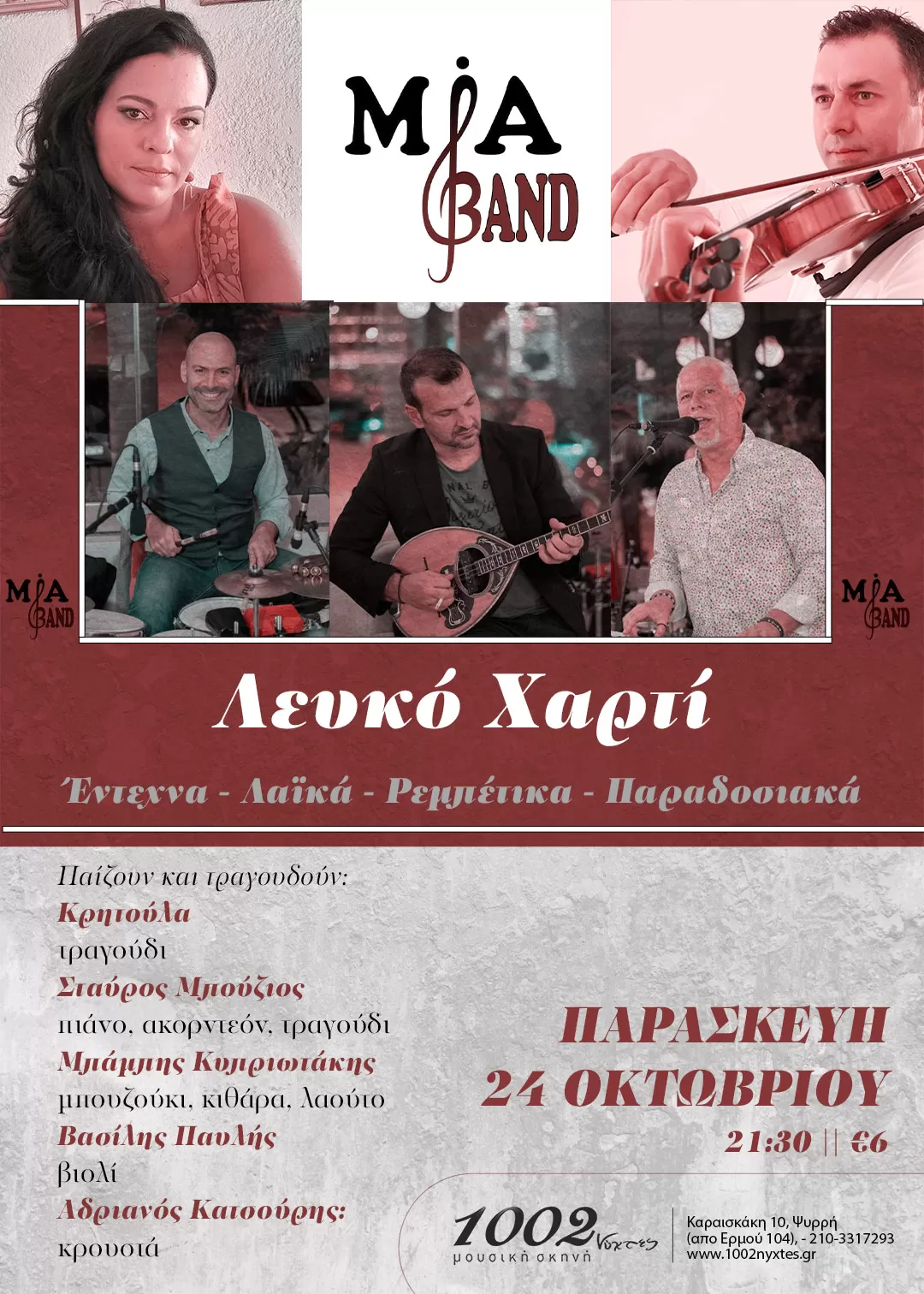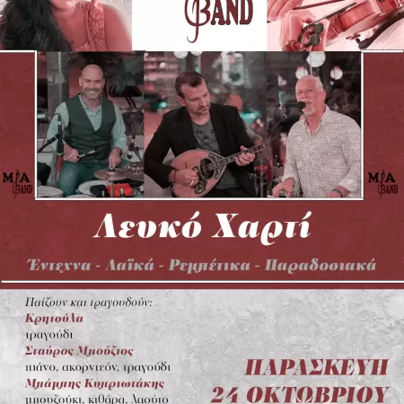 Οι MiaBand θα παρουσιάσουν ένα πρόγραμμα με δικά τους τραγούδια από το πρώτο διπλό album με τίτλο Λευκό Χαρτί και αγαπημένα τραγούδια απ όλη την ελληνική μουσική σκηνή!!!