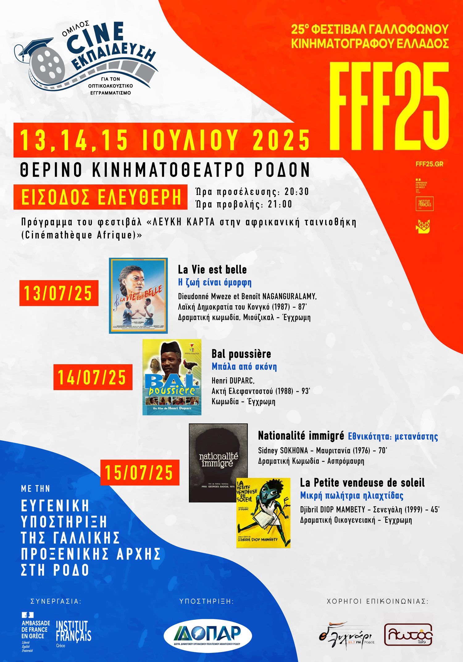 25ο Φεστιβάλ Γαλλόφωνου Κινηματογράφου Ελλάδος | ΤΡΙΗΜΕΡΟ ΠΡΟΒΟΛΩΝ ΣΤΗ ΡΟΔΟ | Θερινό Κινηματοθέατρο Ρόδον | 13-15 Ιουλίου