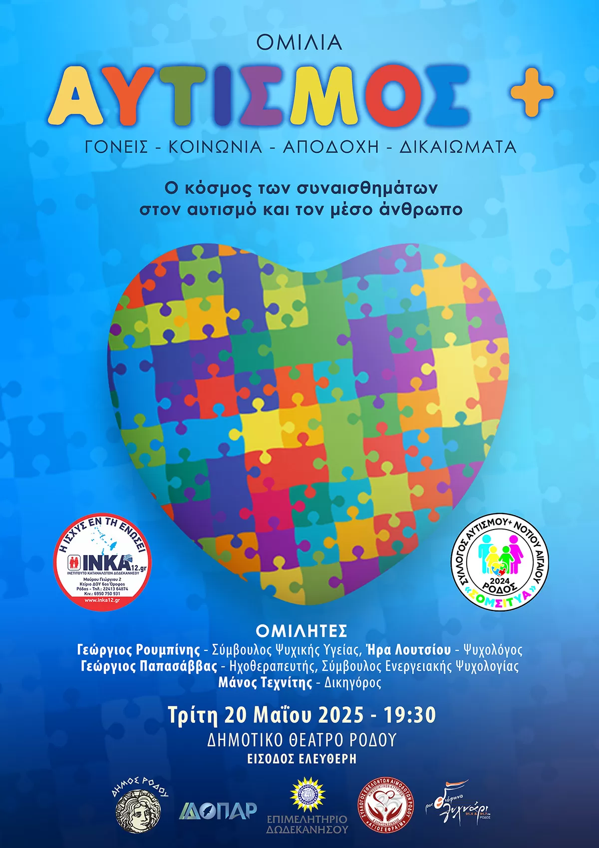 Το Ινστιτούτο Προστασίας Καταναλωτών ΙΝΚΑ12, σε συνεργασία με τον Σύλλογο Γονέων, Φίλων και Ατόμων στο Φάσμα του Αυτισμού ΣΟΜΣΙΤΥΑ, τον Δήμο Ρόδου και την Διεύθυνση ΔΟΠΑΡ, σας προσκαλούν σε μια ξεχωριστή βραδιά ενημέρωσης με θέμα:
