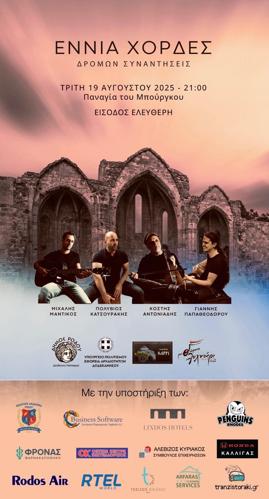 Την Τρίτη 19 Αυγούστου στις 21:00, το μουσικό σχήμα «Εννιά Χορδές» θα γεμίσει τον χώρο με έντεχνη ελληνική μουσική. Στο τραγούδι και στις κιθάρες οι Μιχάλης Μαντικός και Γιάννης Παπαθεοδώρου. Θα συνοδεύει με λύρα με συμπαθητικές χορδές ο Κωστής Αντωνιάδης και με κρουστά ο Πολύβιος Κατσουράκης.