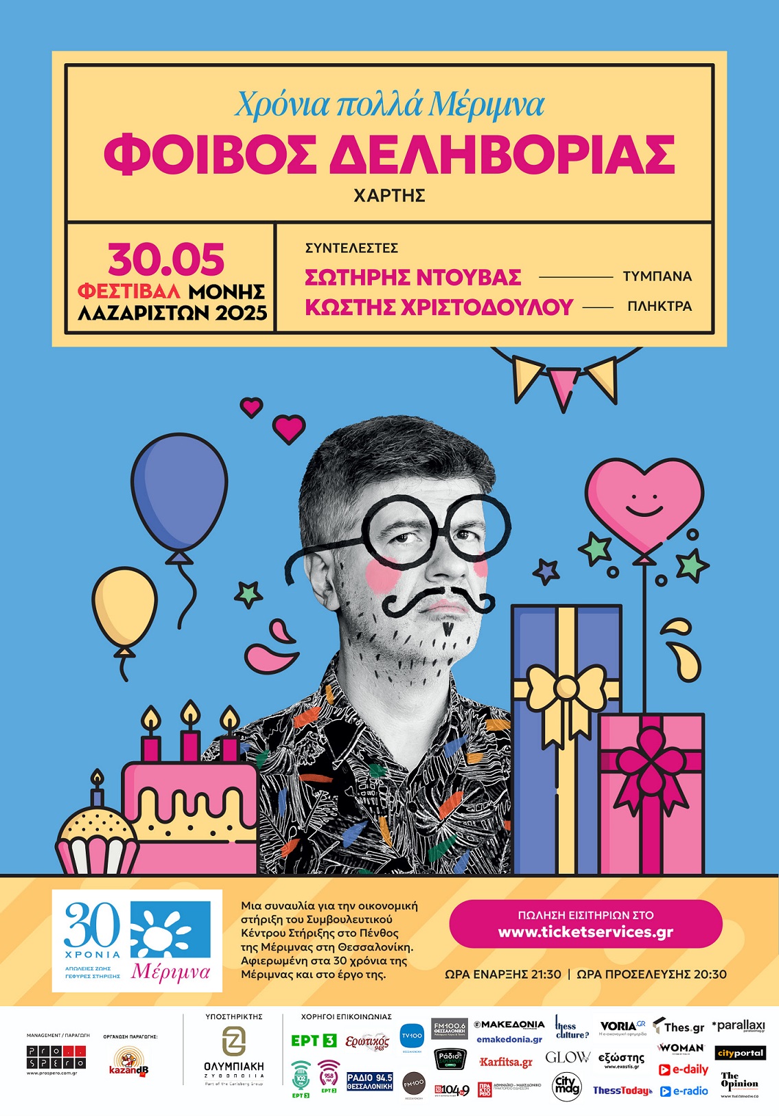 Η Δανάη Παπαδάτου, Πρόεδρος της Μέριμνας, ευχαριστεί από καρδιάς τον Φοίβο Δεληβοριά και τους συνεργάτες του για τη συμμετοχή τους στον εορτασμό των 30 χρόνων κοινωνικού έργου της Μέριμνας που στηρίζει παιδιά και οικογένειες στη σοβαρή αρρώστια και το πένθος. Αναγνωρίζει ότι «τα τραγούδια, η ευαισθησία του λόγου και η μουσική του Φοίβου Δεληβοριά, θα μεταφέρουν το μήνυμα της Μέριμνας ότι με την κατάλληλη στήριξη επαναπροσδιορίζουμε το Νόημα και την Αξία της Ζωής».