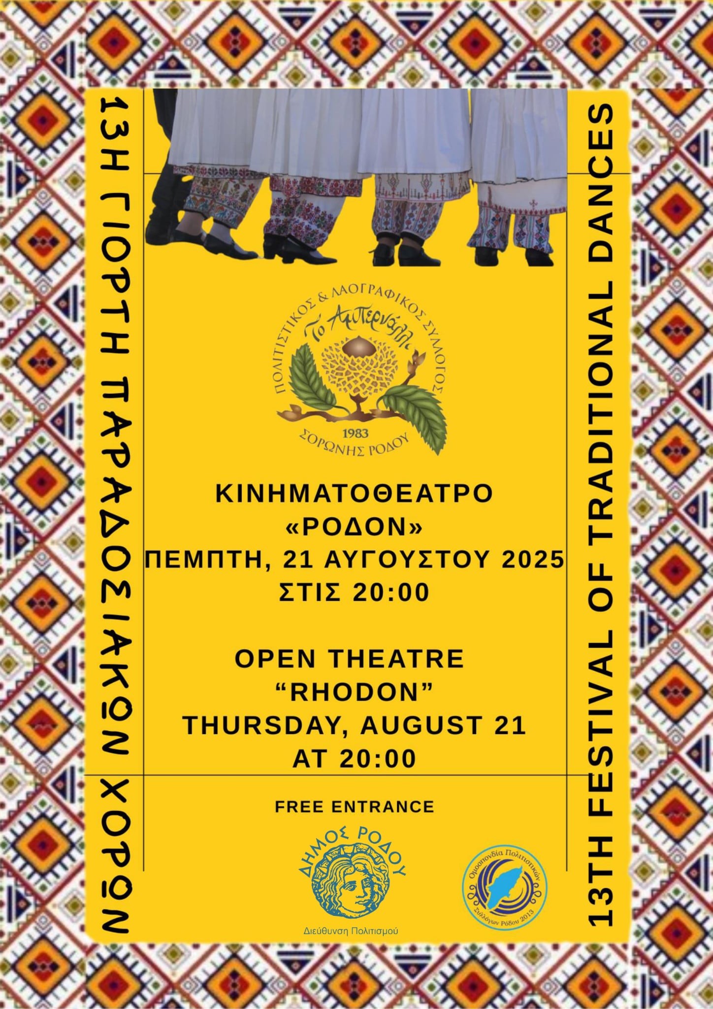 Ο Πολιτιστικός και Λαογραφικός Σύλλογος Σορωνής Ρόδου «Το Αμπερνάλλι», με συνδιοργανωτή τη Διεύθυνση Πολιτισμού Δήμου Ρόδου και τη στήριξη της Ομοσπονδίας Πολιτιστικών Συλλόγων Ρόδου, σας προσκαλούμε στη 13η Γιορτή Παραδοσιακών Χορών, η οποία θα πραγματοποιηθεί την Πέμπτη 21 Αυγούστου 2025, στις 20:00, στο ανοικτό κινηματοθέατρο Ρόδον.