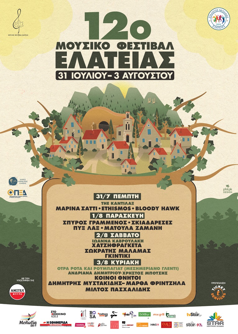 Ο Σύλλογος Νεολαίας Ελάτειας μας προσκαλεί στο 12ο Μουσικό Φεστιβάλ Ελάτειας, για να ζήσουμε όλοι μαζί μία μοναδική εμπειρία σε μια υπέροχη τοποθεσία μέσα στη φύση ανάμεσα σε πλατάνια, πεύκα και ρυάκια. Τα μεγαλύτερα ονόματα της ελληνικής έντεχνης και εναλλακτικής μουσικής θα είναι εδώ σε ένα τετραήμερο φεστιβάλ γεμάτο μουσική και ενέργεια!