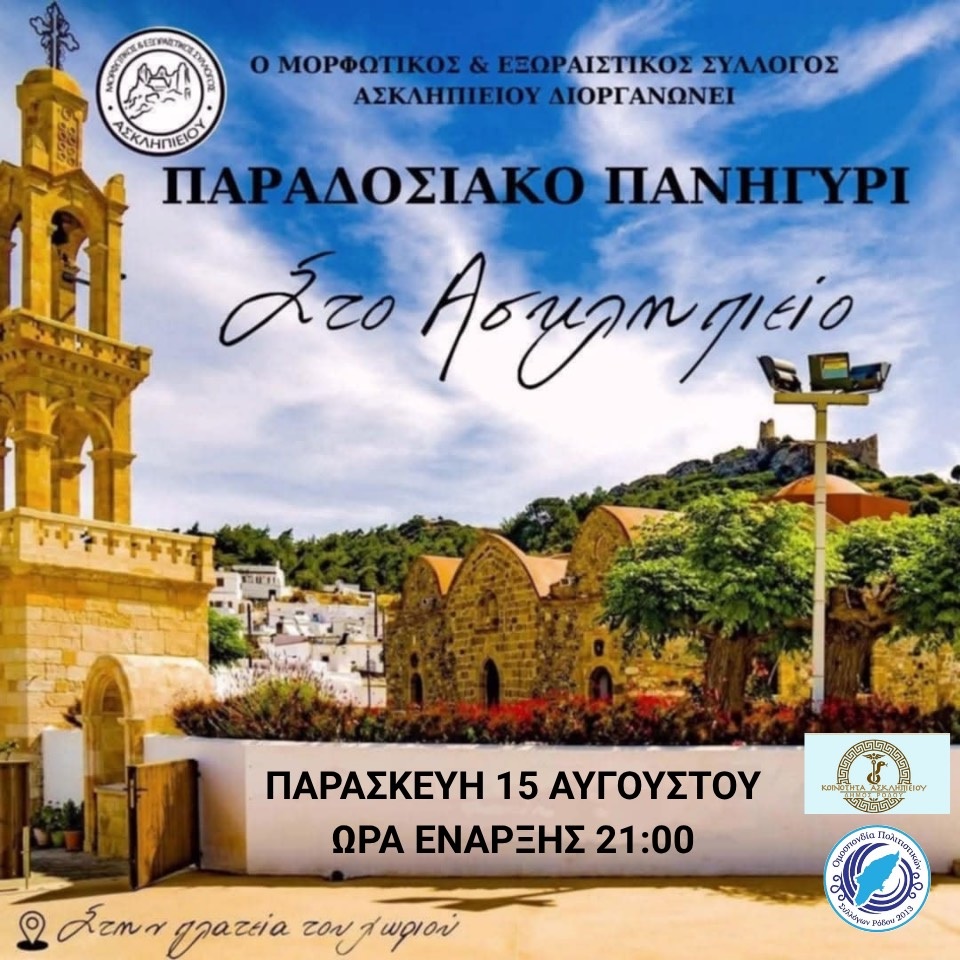 Εικόνα Τετ, 06/08/2025 - 21:41Rhodes Events Παραδοσιακό Πανηγύρι στο Ασκληπιείο | 15 ΑυγούστουΠΑΡΑΔΟΣΙΑΚΟ ΠΑΝΗΓΥΡΙΣτο ΑσκληπιείοΠΑΡΑΣΚΕΥΗ 15 ΑΥΓΟΥΣΤΟΥώρα έναρξης: 21:00