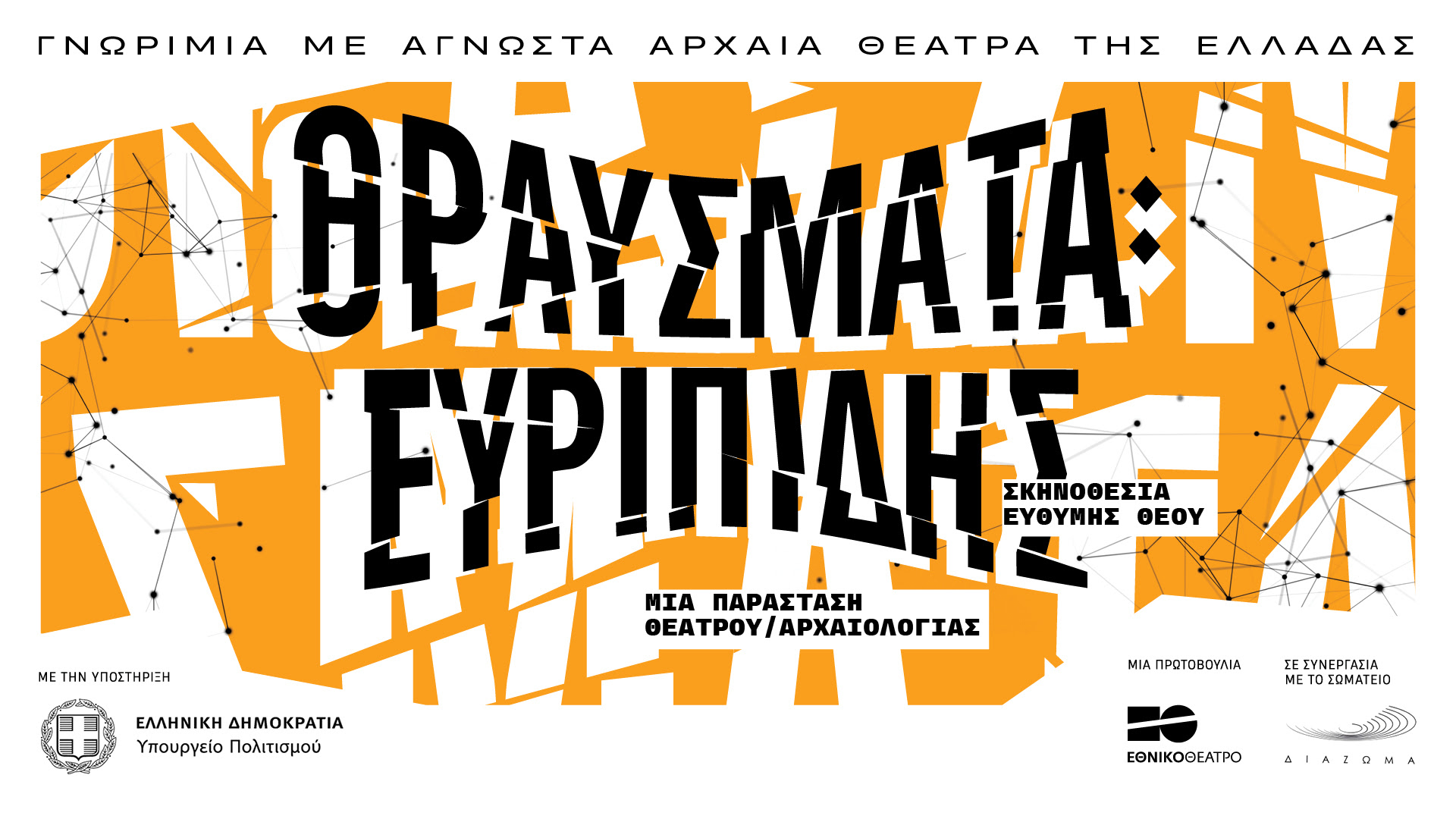 Το Εθνικό Θέατρο ως εποπτευόμενος φορέας του ΥΠΠΟ και με την υποστήριξή του, σε συνεργασία με το Σωματείο ΔΙΑΖΩΜΑ, πραγματοποιεί για 2η συνεχόμενη χρονιά το πρόγραμμα «Γνωριμία με Αρχαία Θέατρα της Ελλάδας». Η καινοτόμος αυτή δράση ανάδειξης των σωζόμενων αρχαίων θεάτρων της Ελλάδας περιλαμβάνει φέτος περιοδεία της παραγωγής «ΘΡΑΥΣΜΑΤΑ: Ευριπίδης», μια παράσταση θεάτρου/αρχαιολογίας, σε σκηνοθεσία Ευθύμη Θέου, με τη συμμετοχή ενός θιάσου ξεχωριστών καλλιτεχνών του ελληνικού θεάτρου. Η είσοδος είναι δωρεάν με ηλεκτρονική προκράτηση θέσεων εδώ.